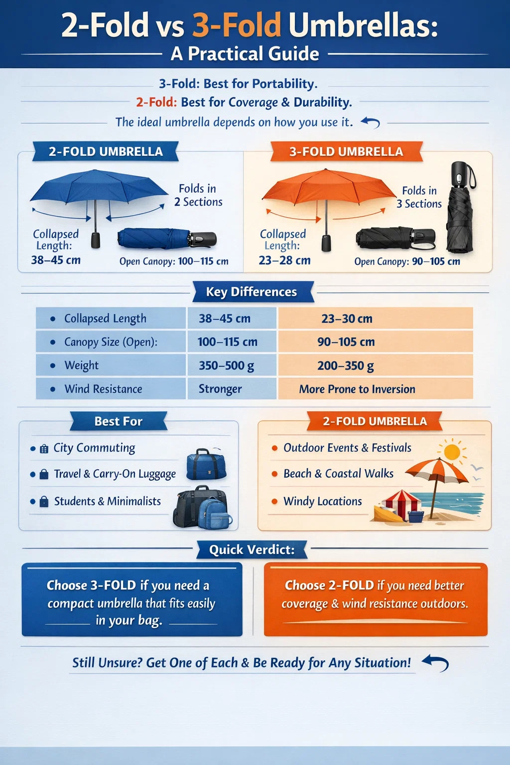 Si realmente no puedes decidir, compre uno de cada uno al precio de $ 25 a $ 40 — mantén el triple en tu bolso diario y el doble junto a la puerta para los días en los que sabes que el clima va a ser malo. El gasto combinado sigue siendo inferior al de un único paraguas premium y ha cubierto todos los escenarios del mundo real.