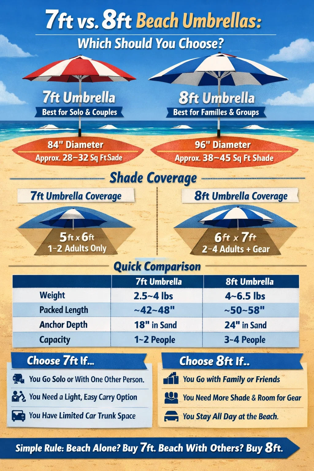 Si está comprando una sombrilla de playa y se pregunta si 7 pies u 8 pies es la mejor opción, aquí tiene la respuesta directa: una sombrilla de playa de 8 pies es mejor para grupos de 3 o más personas, mientras que una sombrilla de 7 pies es una elección más inteligente para personas o parejas que priorizan la portabilidad. La diferencia en el diámetro del dosel entre estos dos tamaños se traduce en una brecha significativa en la sombra utilizable, y esa brecha es importante cuando intentas mantener fresca a toda tu familia en una calurosa tarde de verano.
