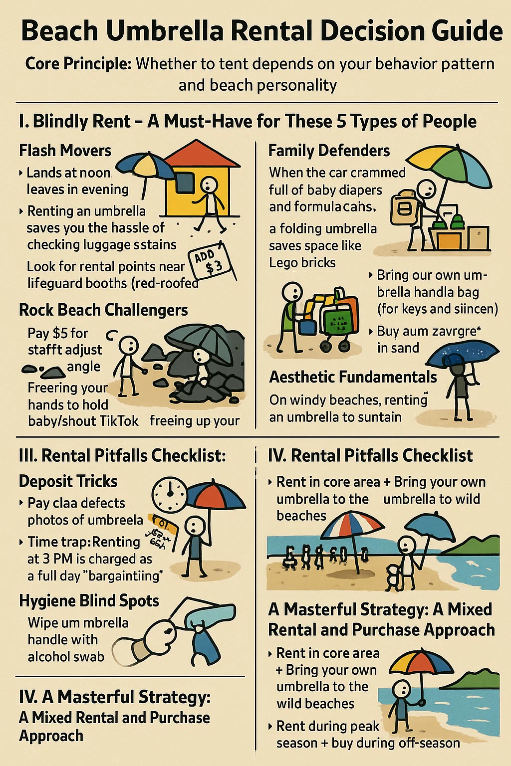 Trampa del tiempo: alquilar a las 3 p. m. se cobra como un día completo → Tácticas de negociación: "¿La mitad de precio por una sombrilla al atardecer?"