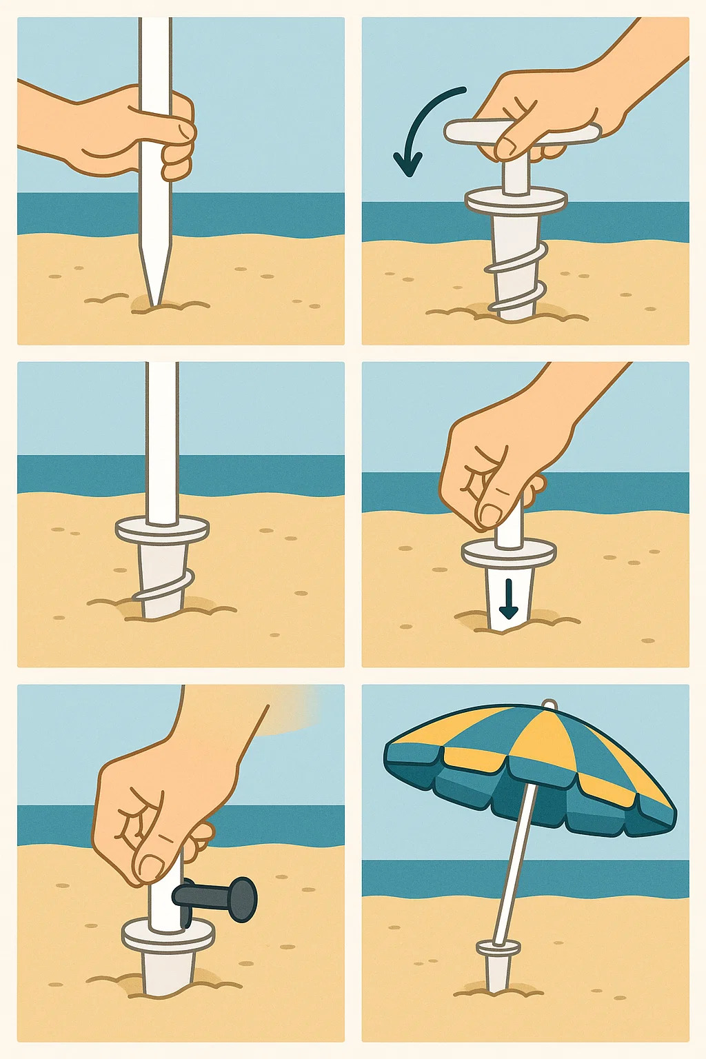 Usando un ancla de arena con su sombrilla de playa asegurará que el paraguas permanezca estable con la brisa del mar. Aquí están los pasos detallados:
