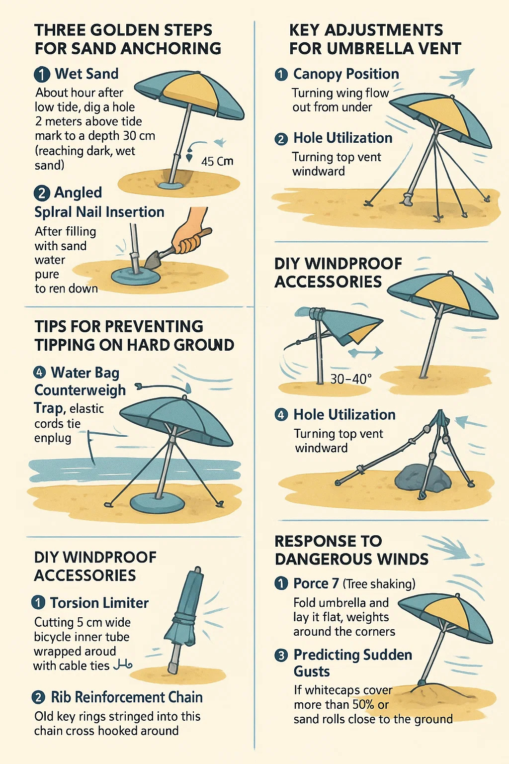 Entierro y martilleo con arena: después de llenar la arena, vierta agua y apisónela para formar una capa endurecida similar al cemento. Después de insertar el paraguas, presione la base durante 10 segundos para aplicar presión.