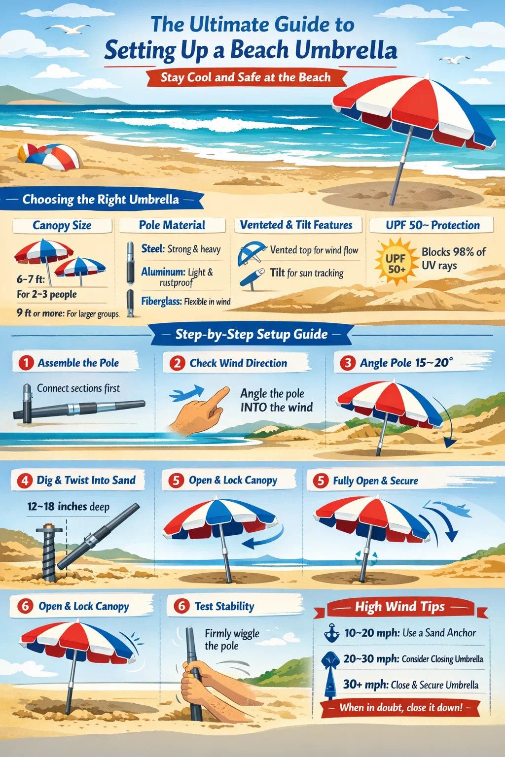 Esta guía cubre cada paso en detalle, desde elegir la sombrilla de playa adecuada hasta mantenerla estable en ráfagas de más de 20 mph, para que pueda pasar menos tiempo luchando con el equipo y más tiempo disfrutando del agua.