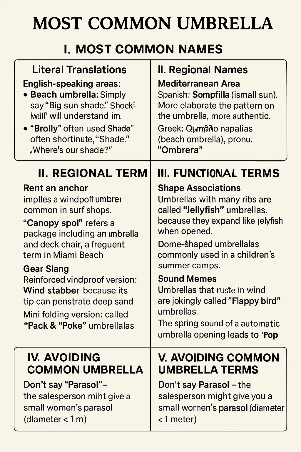 Aquí hay nombres comunes para sombrillas de playa en diferentes contextos: