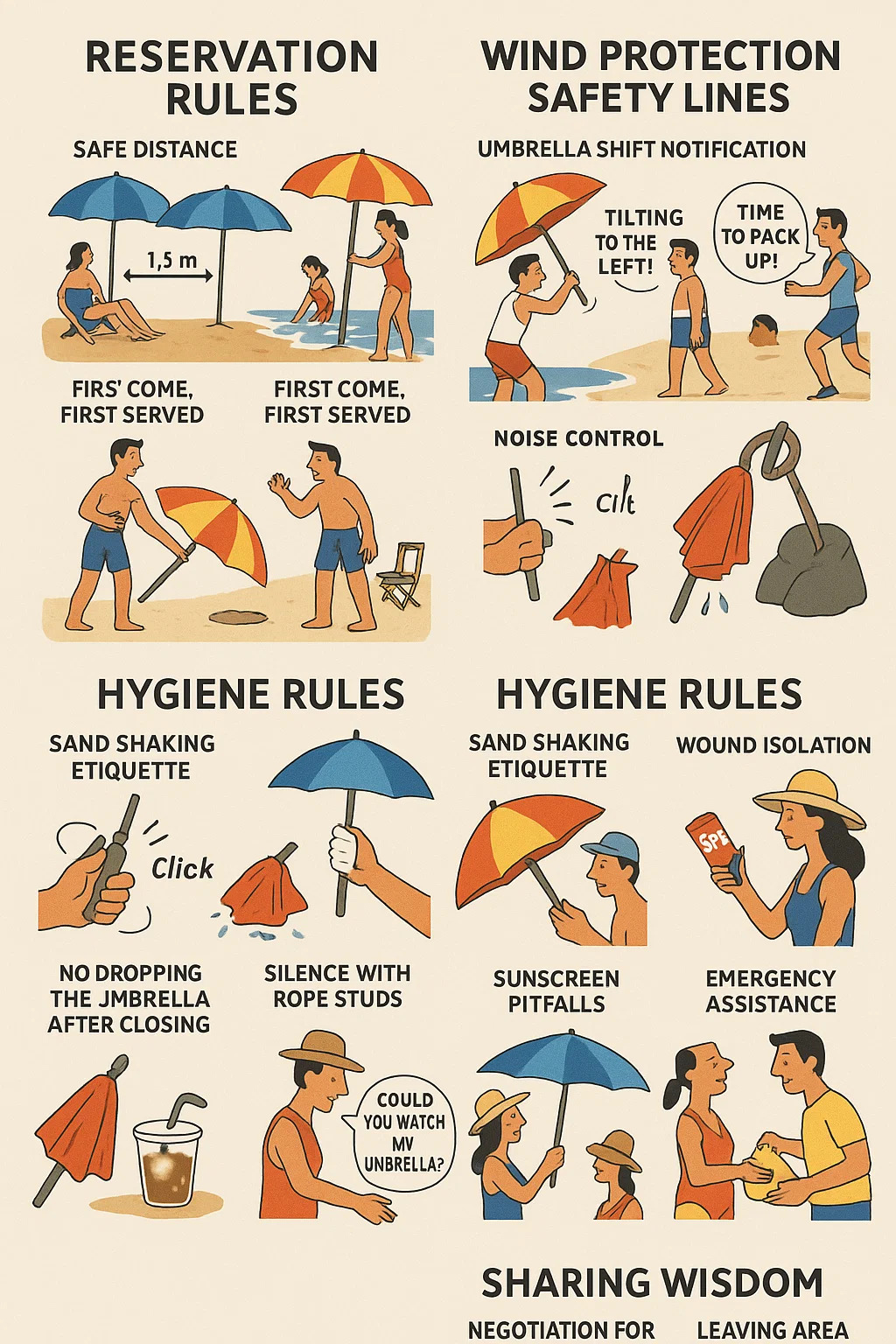 Distancia Segura: Mantenga una distancia del ancho de dos sillas de playa (aproximadamente 1,5 metros) de la sombrilla de su vecino. Si la sombra de tu paraguas se desvía del área de otra persona, discúlpate y ajústala en consecuencia.