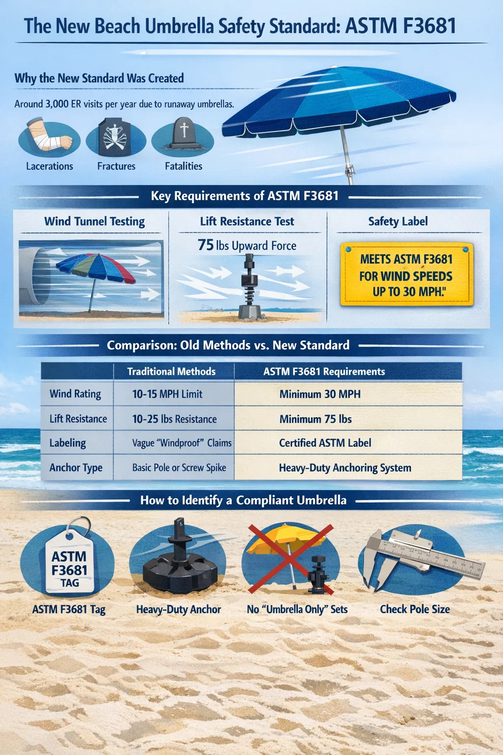 el nuevo estándar de sombrillas de playa También tiene implicaciones importantes para hoteles, complejos turísticos y empresas de alquiler de playas. Los municipios exigen cada vez más que todas las estructuras comerciales de sombra proporcionadas al público cumplan con los puntos de referencia ASTM F3681-24 para reducir la responsabilidad. Si bien el estándar es técnicamente voluntario para los fabricantes, rápidamente se está convirtiendo en un requisito obligatorio para los proveedores de seguros y las agencias de gestión de playas en todo Estados Unidos.