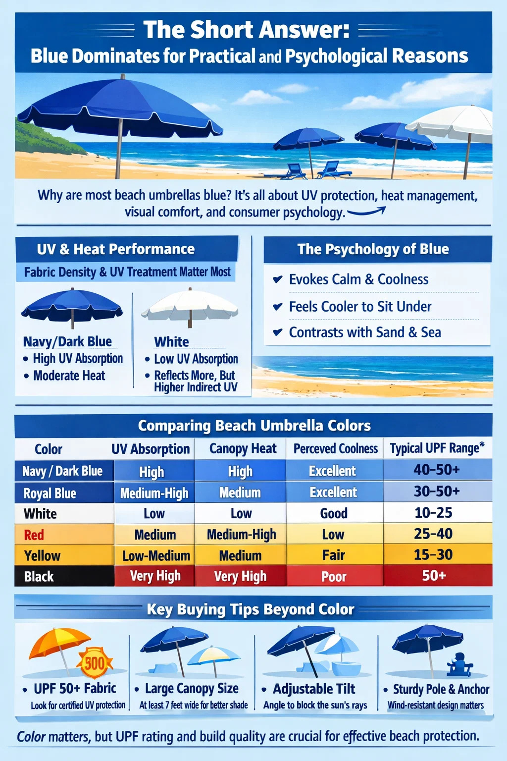 La psicología del color juega un papel importante en el diseño de productos y el mercado de las sombrillas de playa no es una excepción. La investigación de consumidores sobre productos de ocio al aire libre encuentra consistentemente que El azul evoca frescura, calma y relajación. – asociaciones que se alinean directamente con lo que alguien quiere sentir cuando está sentado en una playa calurosa.